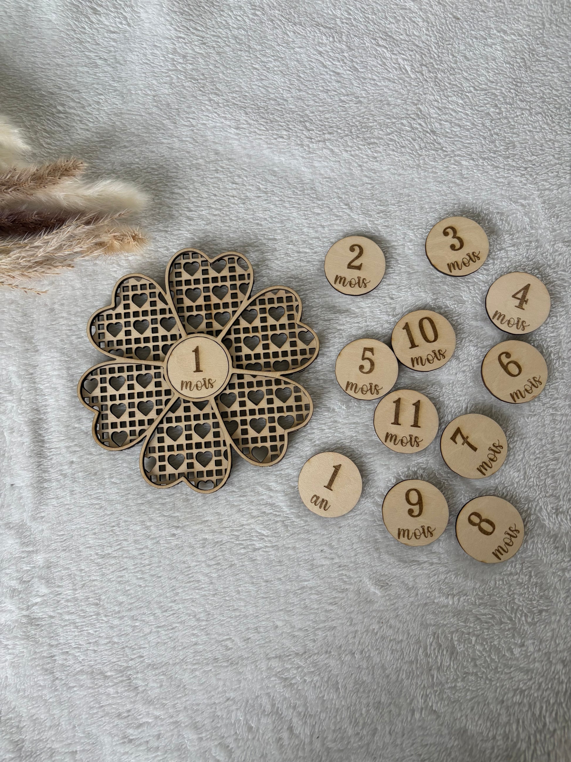 Au centre de la fleur, vous pouvez glisser des ronds interchangeables indiquant l’âge de votre bout de chou : de 1 mois à 12 mois. Parfaite pour réaliser de magnifiques photos mensuelles et suivre son évolution tout au long de sa première année.