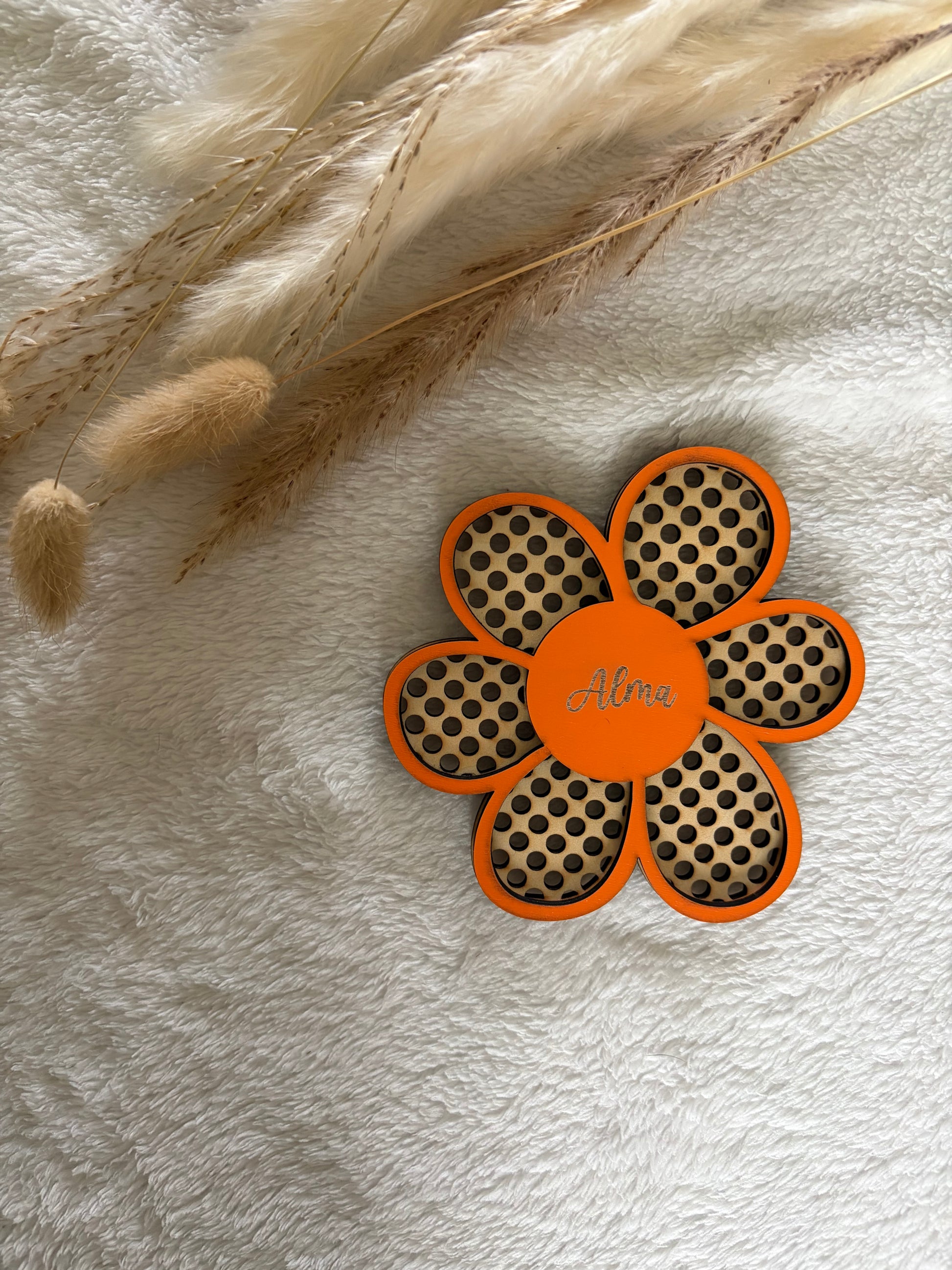 Cette fleur en bois et cannage apporte une touche naturelle et délicate à la décoration.