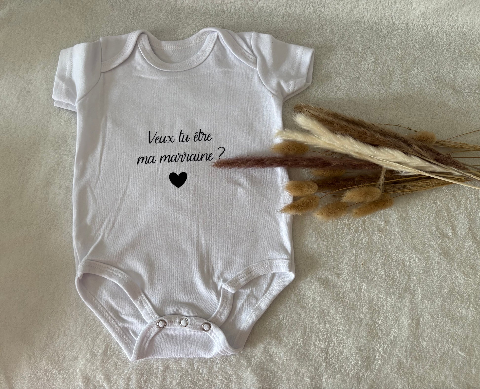 Annoncez cette grande nouvelle de façon originale et émouvante grâce à notre body bébé personnalisé avec l’inscription “Veux-tu être ma marraine ?”. Une surprise tendre et mémorable qui fera fondre le cœur de la future marraine.