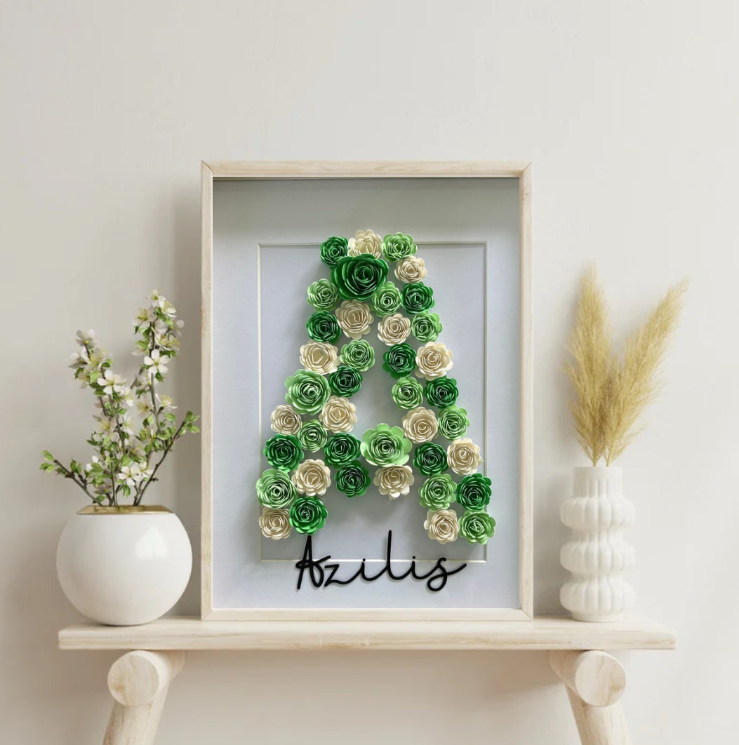 Un cadre unique décoré de fleurs en papier 3D, roulées et assemblées à la main. Choisissez la forme ou la lettre de votre choix pour une création élégante et pleine de délicatesse