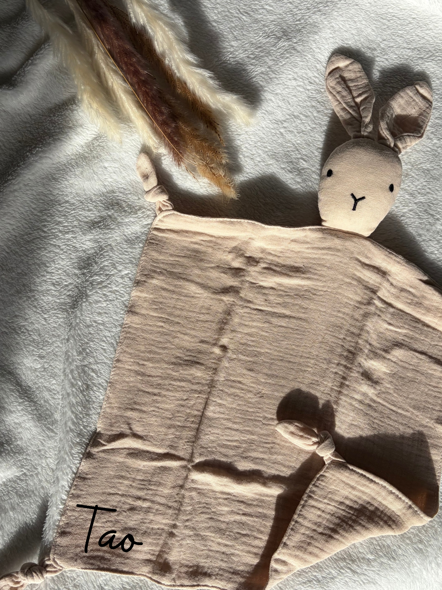 Ce doudou lapin en gaze de coton, disponible en 3 coloris, peut être personnalisé avec le prénom de bébé floqué dessus, pour un cadeau tendre et unique.