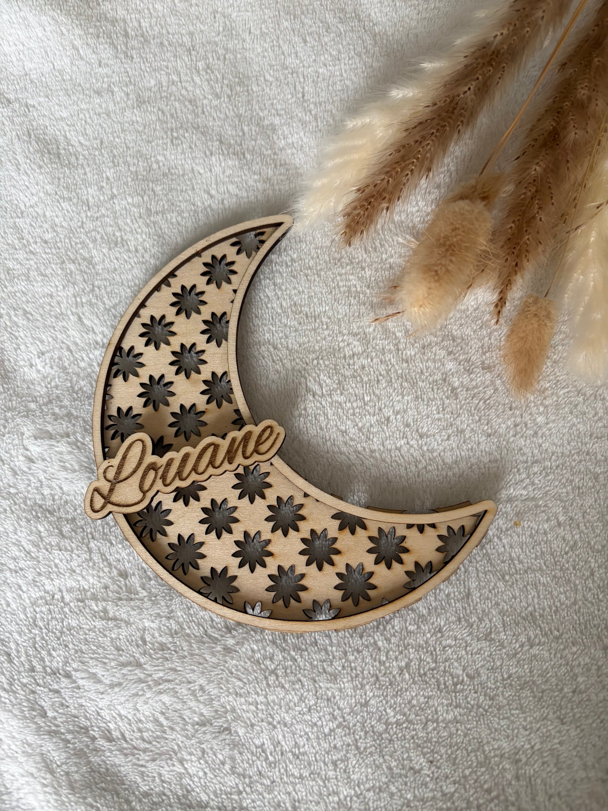 Le prénom gravé vient personnaliser délicatement la création, pour un rendu poétique et intemporel.