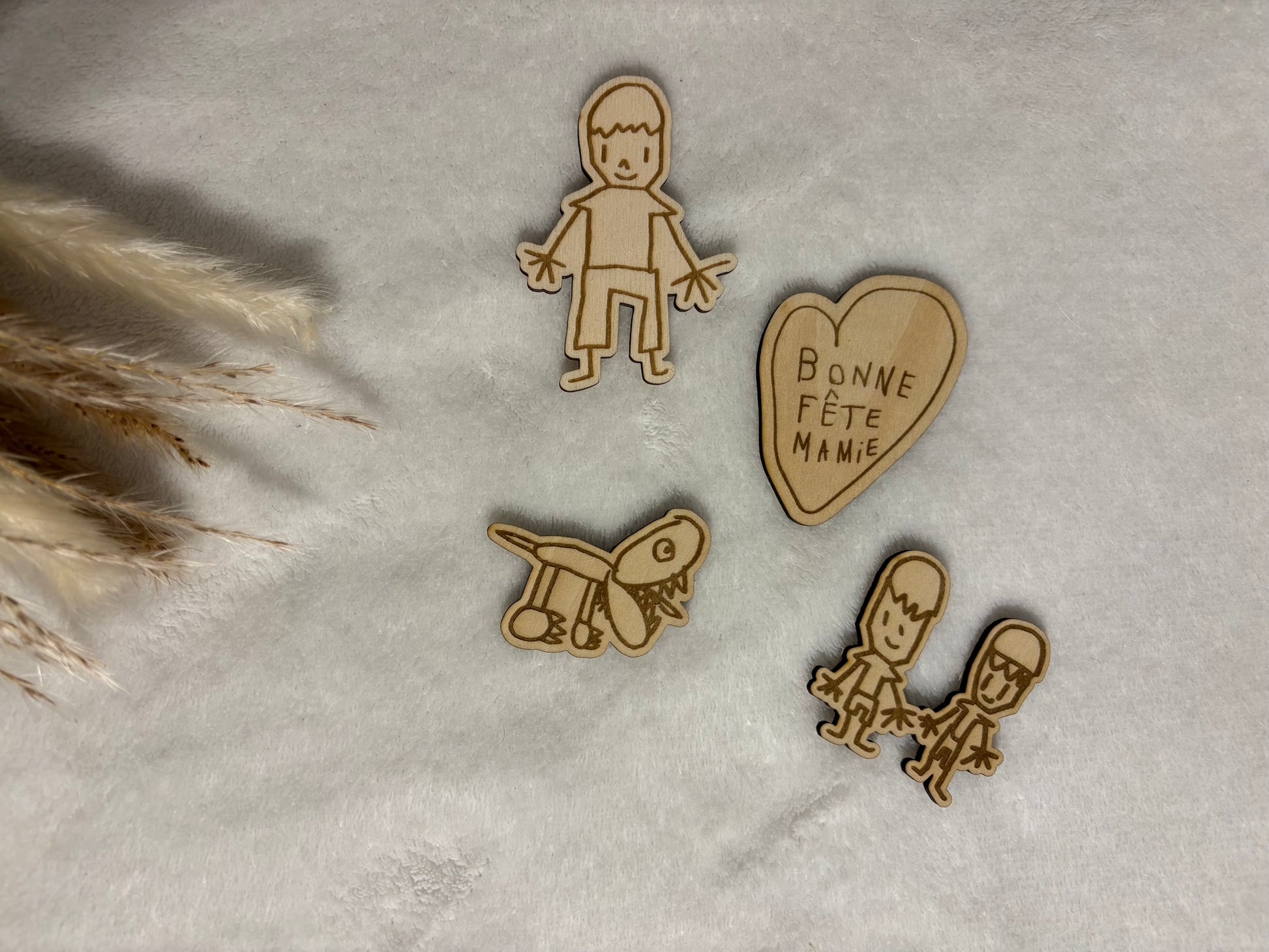 Votre enfant réalise un dessin au feutre noir sur une simple feuille, et nous le transformons en magnet en bois gravé, prêt à être affiché comme un vrai petit chef-d’œuvre.