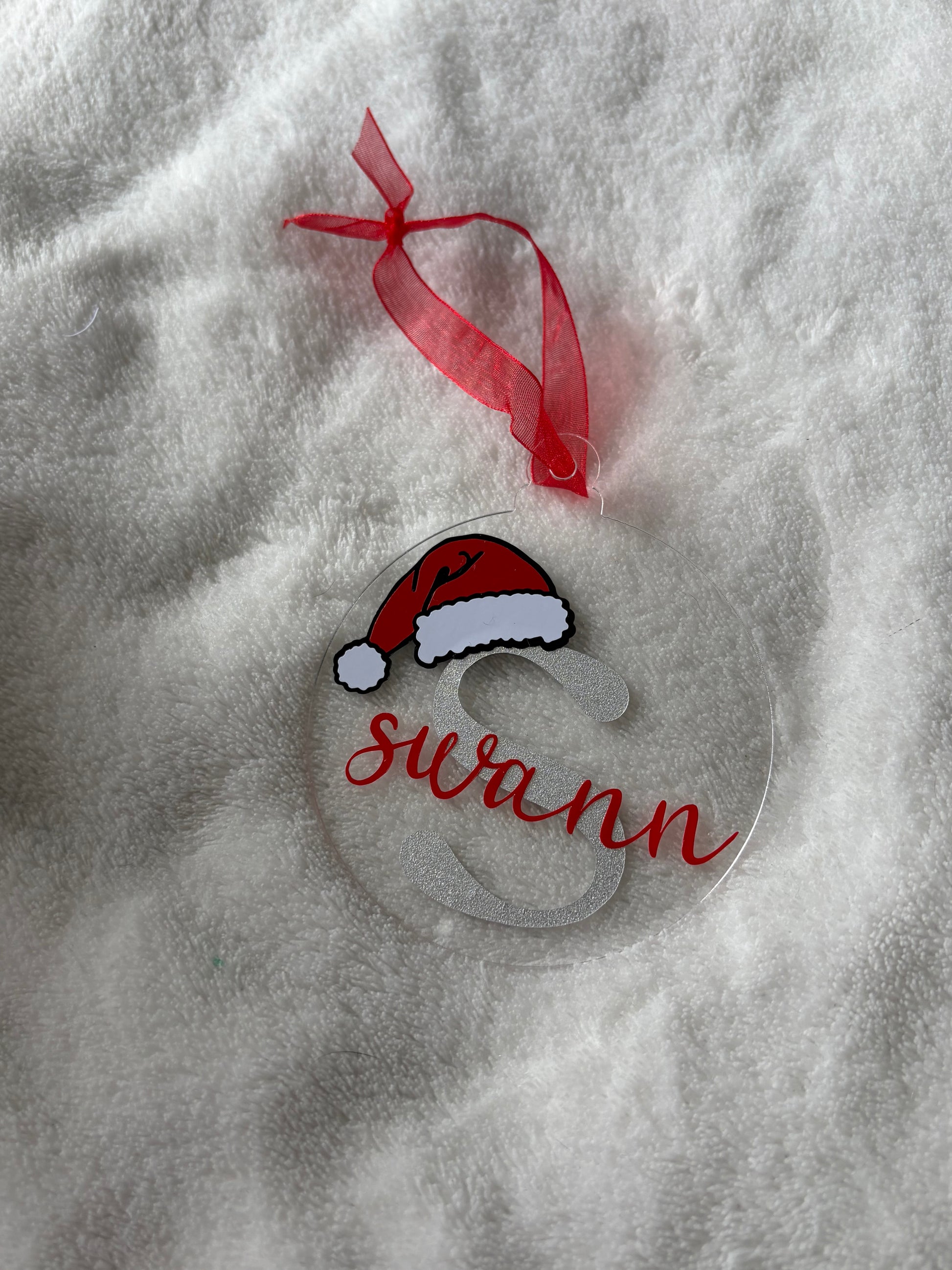 Faites briller votre sapin avec cette boule de Noël plate personnalisée, mettant en valeur une initiale en doré ou argenté, surmontée d’un petit bonnet de Noël et accompagnée du prénom de votre choix au centre.